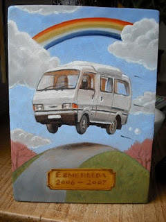 I wanted to try out mounting paper on board for oil painting and so used that as an excuse to paint this for Suzanne. The vehicle in question is her old camper van 'Ezmerelda' (that's how Suzanne likes to spell it) which now resides in a field next to her engine which is on a wooden palette. Despite this Ezmerelda will always be seen as Suzanne's ticket to the open road, even if it did spend most of the time parked on the kerb steaming.